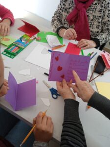 La propuesta está siendo realizar talleres creativos para el diseño y confección de tarjetas postales, realizadas por personas usuarias de los grupos que de manera regular acompaña el equipo del CDR.