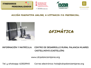 Así, en Castellnovo (Castellón) y en los pueblos de las comarcas del Alto Palancia y del Alto Mijares, COCEDER, en colaboración con el CDR Palancia Mijares, continua con los Itinerarios de Inserción Sociolaboral para luchar contra la despoblación rural adaptándolos al teletrabajo y a las nuevas tecnologías. Durante este tiempo está atendiendo, por teléfono, whatsapp y correo electrónico las consultas de las personas interesadas en comenzar un itinerario individualizado y de las personas que ya los han comenzado. Además continúan dando formación on line a través del aula de centro.
